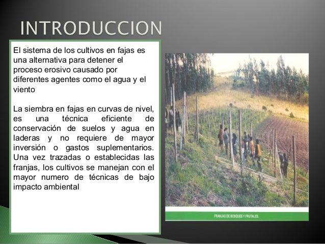 - El sistema de los cultivos en fajas es una alternativa para detener el proceso erosivo causado por diferentes agentes como el agua y el viento La siembra en fajas en curvas de nivel, es una técnica eficiente de conservación de suelos y agua en laderas y no requiere de mayor inversión o gastos suplementarios. Una vez trazadas o establecidas las franjas, los cultivos se manejan con el mayor numero de técnicas de bajo impacto ambiental