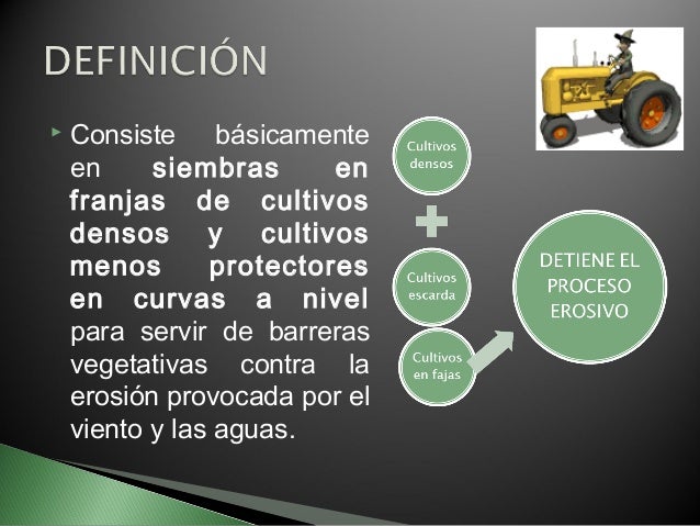 - 2. Consiste básicamente en siembras en franjas de cultivos densos y cultivos menos protectores en curvas a nivel para servir de barreras vegetativas contra la erosión provocada por el viento y las aguas.