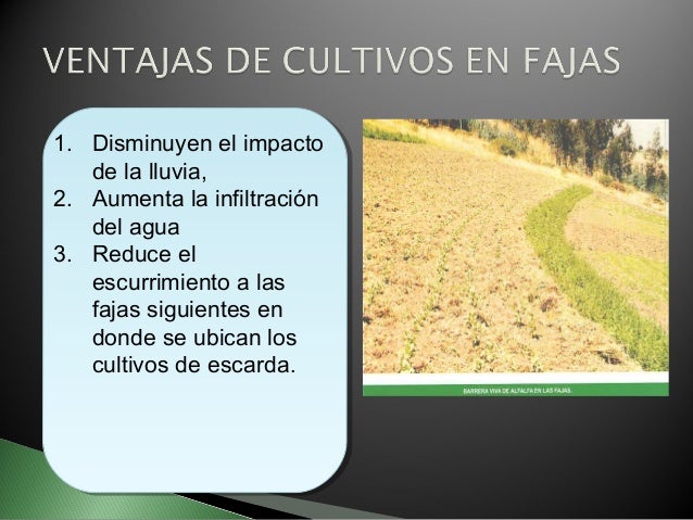 - 3. 1. Disminuyen el impacto de la lluvia, 2. Aumenta la infiltración del agua 3. Reduce el escurrimiento a las fajas siguientes en donde se ubican los cultivos de escarda.