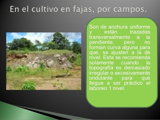 - 5. Son de anchura uniforme y están trazadas transversalmente a la pendiente, pero no forman curva alguna para que, se ajusten a la de nivel. Esta se recomienda solamente cuando la topografía es demasiado irregular o excesivamente ondulante para que llegue a ser práctico el laboreo 1 nivel.