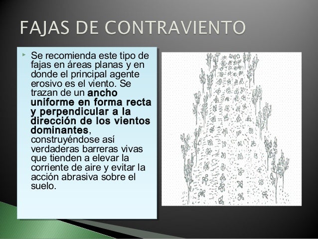 - Se recomienda este tipo de fajas en áreas planas y en donde el principal agente erosivo es el viento. Se trazan de un ancho uniforme en forma recta y perpendicular a la dirección de los vientos dominantes, construyéndose así verdaderas barreras vivas que tienden a elevar la corriente de aire y evitar la acción abrasiva sobre el suelo.