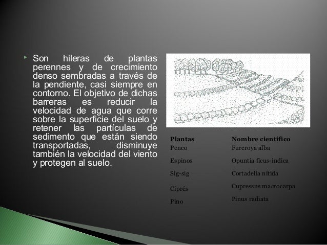 - 7. Son hileras de plantas perennes y de crecimiento denso sembradas a través de la pendiente, casi siempre en contorno. El objetivo de dichas barreras es reducir la velocidad de agua que corre sobre la superficie del suelo y retener las partículas de sedimento que están siendo transportadas, disminuye también la velocidad del viento y protegen al suelo. Plantas Nombre científico Penco Espinos Sig-sig Ciprés Pino Furcroya alba Opuntia ficus-indica Cortadelia nítida Cupressus macrocarpa Pinus radiata